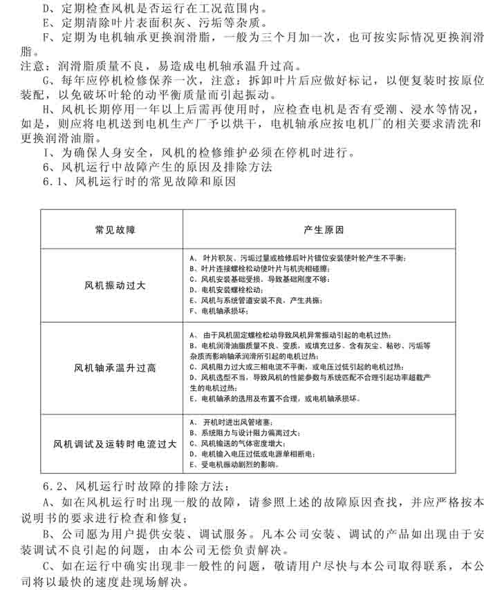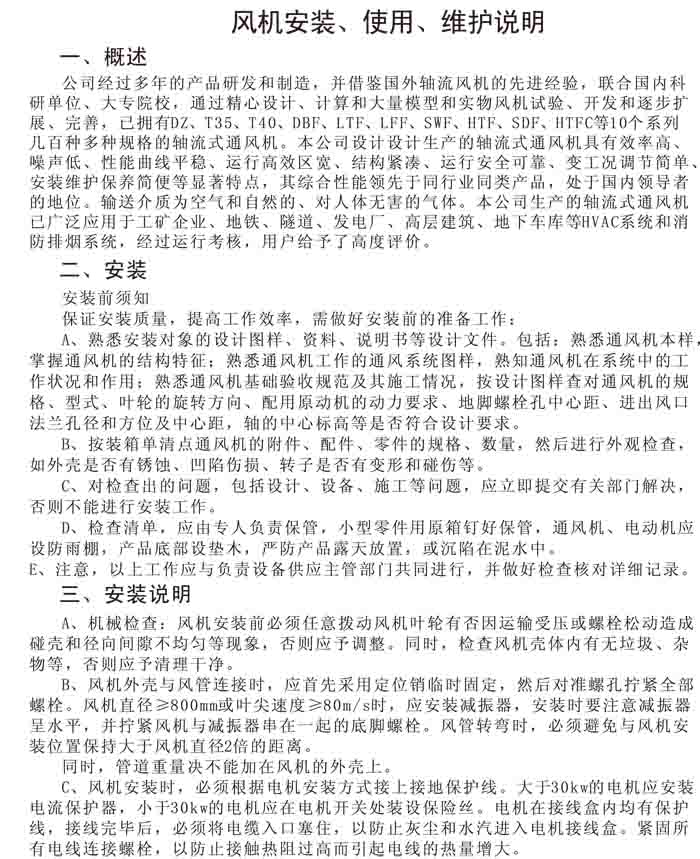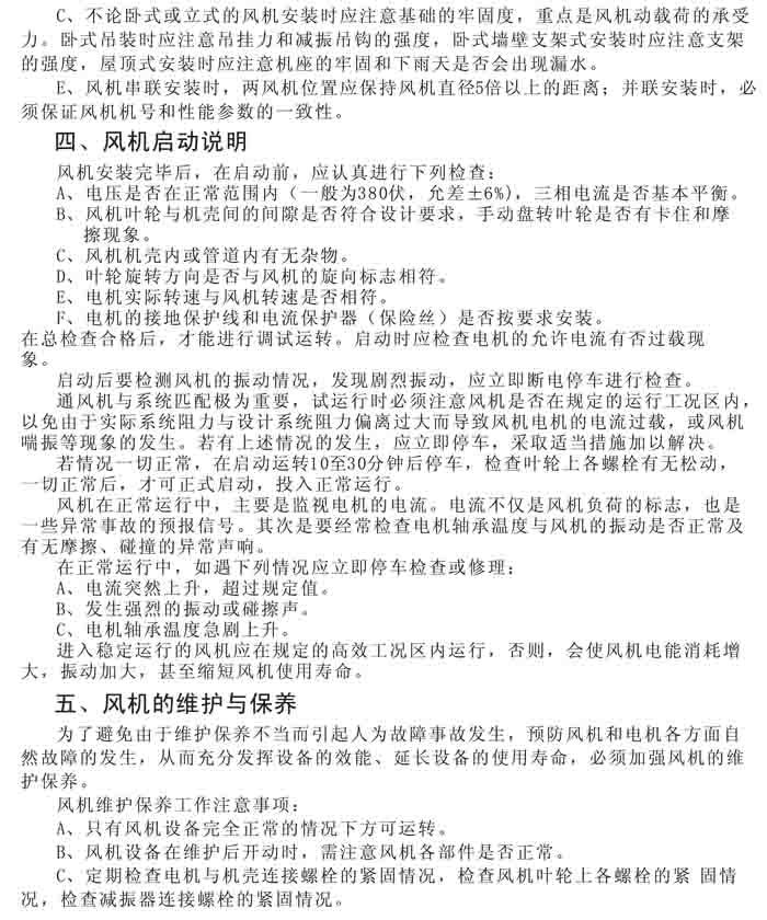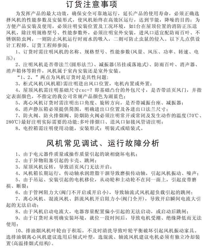 一、風(fēng)機選用參考、安裝維護使用說明、常見故障分析、訂貨注意事項